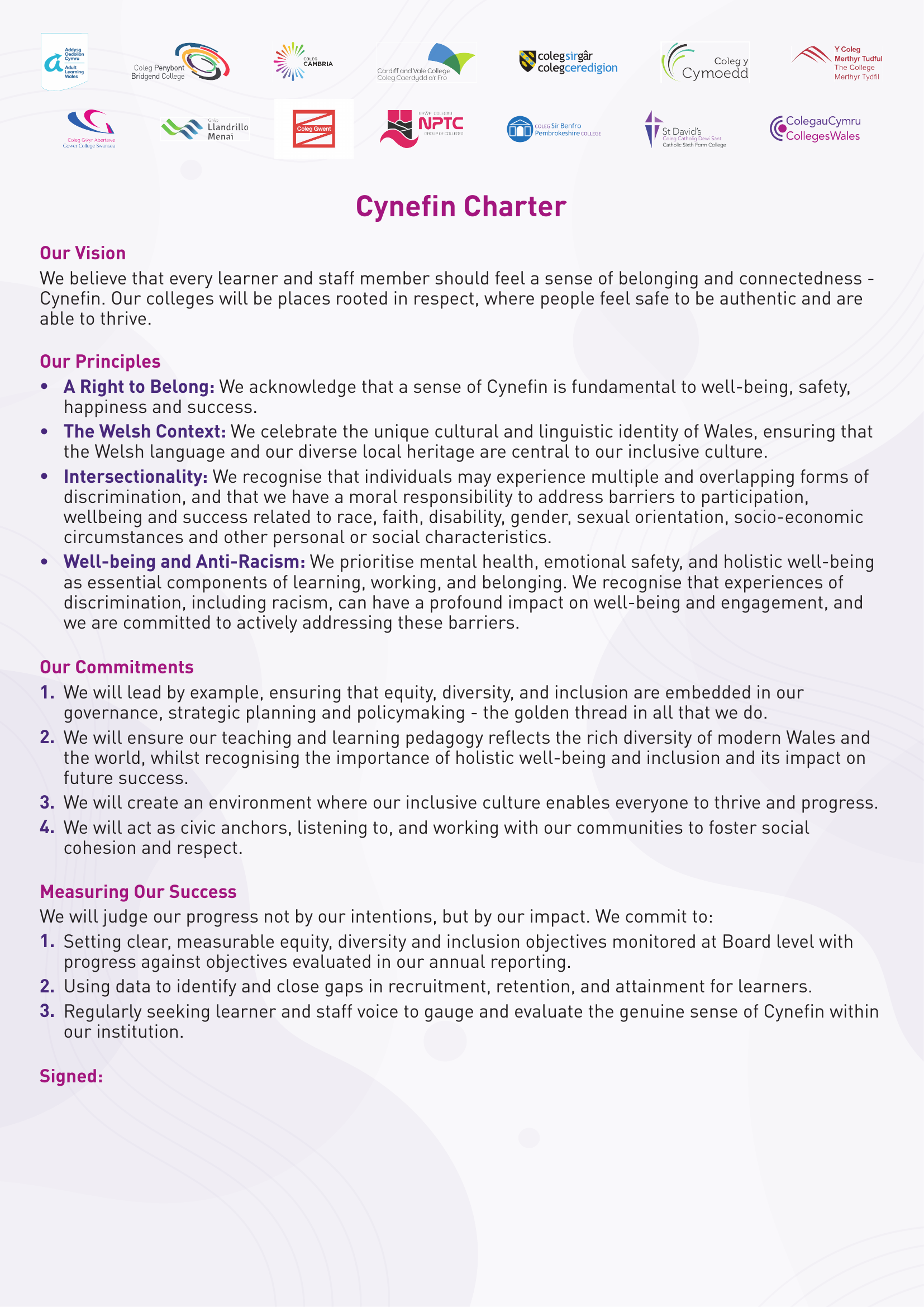 The Charter recognises that a sense of belonging is fundamental to wellbeing, safety, happiness and success. It also celebrates the unique cultural and linguistic identity of Wales, ensuring that the Welsh language and the diverse heritage of local communities remain central to inclusive college cultures.